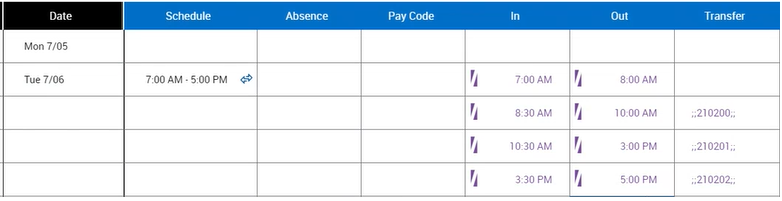 For example, the timecard below shows an employee that works a shift from 7AM-5PM. All shift details appear in the employee’s timecard, including system-generated breaks and transfers.
