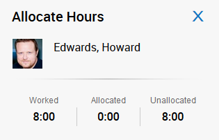 The Allocate Hours panel opens and provides the employee name, their worked hours, allocated hours, and unallocated hours. The unallocated hours are the available hours that can be allocated. The allocated and unallocated values update automatically as you allocate hours in the panel.